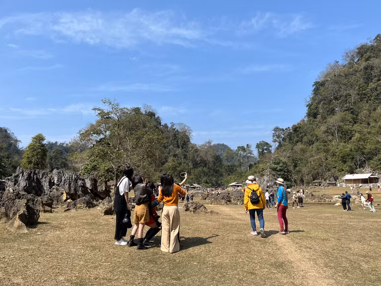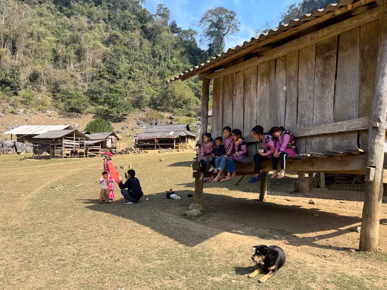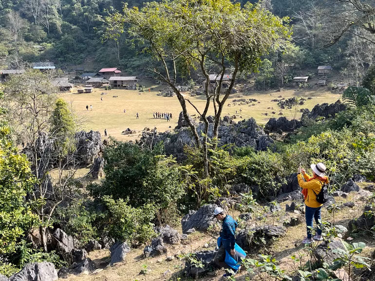 Mấy chục nóc nhà lặng lẽ bên sườn núi, bao quanh thung lũng rộng hơn 1ha. Những em nhỏ dân tộc Mông áo váy sặc sỡ, hai má hây đỏ, hồn nhiên nô đùa trên bãi cỏ dưới cái nắng hanh hao nhưng không e ngại khi du khách ân cần thăm hỏi. Lợn, gà, dê, bò thủng thẳng quanh những phiến đá nhấp nhô. Gặp khi thời tiết ưu ái, du khách tha hồ chiêm ngưỡng và ghi lại những khung hình tuyệt đẹp bởi cảnh quan tựa những thước phim với không gian đất trời hòa quyện.
