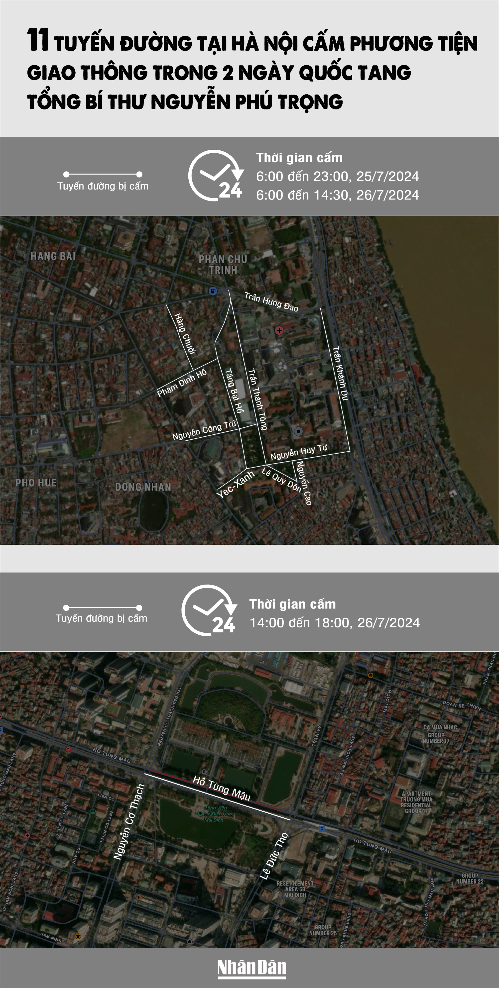 Trong 2 ngày Quốc tang Tổng Bí thư Nguyễn Phú Trọng (25 và 26/7/2024), 11 tuyến đường tại Hà Nội cấm các phương tiện giao thông lưu thông (trừ xe có phù hiệu bảo vệ, xe phục vụ lễ Quốc tang).