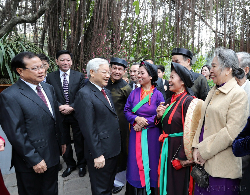 Tổng Bí thư Nguyễn Phú Trọng thăm hỏi, chúc Tết nhân dân Thủ đô Hà Nội đang vui xuân bên Đền Ngọc Sơn. Ảnh: Trí Dũng-TTXVN