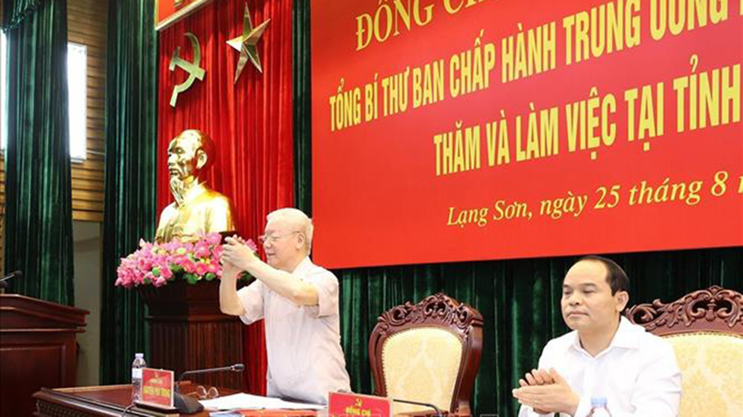 | Tổng Bí thư Nguyễn Phú Trọng đến làm việc với Ban Thường vụ và lãnh đạo chủ chốt tỉnh Lạng Sơn. (Ảnh: TTXVN) |